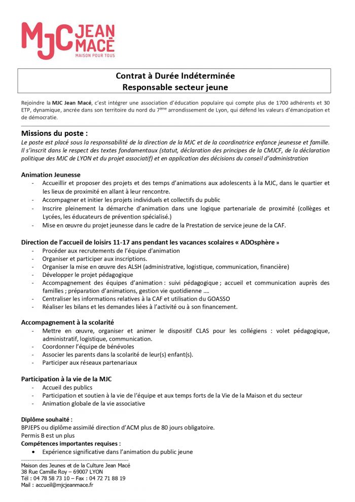 Merci de transmettre votre candidature avant le 13/04/2026 à l’adresse direction@mjcjeanmace.fr.